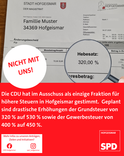 Zentraler Kritikpunkt der SPD ist der Haushalt 2026 mit geplanten Grundsteuererhöhungen von derzeit 320 % auf 530 % sowie einer Gewerbesteuererhöhung von 400 auf 450 %. Diese zusätzliche Belastung für die Bürgerinnen und Bürger ist völlig inakzeptabel. Wir kritisieren, dass Bürgermeister Torben Busse (CDU) – wie bereits in den beiden vergangenen Jahren – ausschließlich Steuererhöhungen für einen Haushaltsausgleich der Stadt Hofgeismar vorschlägt. Eigene innovative Ideen fehlen hier leider ebenso wie bei der CDU, die im letzten Ausschuss als einzige Fraktion für diesen Weg gestimmt hat. Wir fordern – wie auch in den Vorjahren – neue Wege in der Verwaltung zu gehen.
