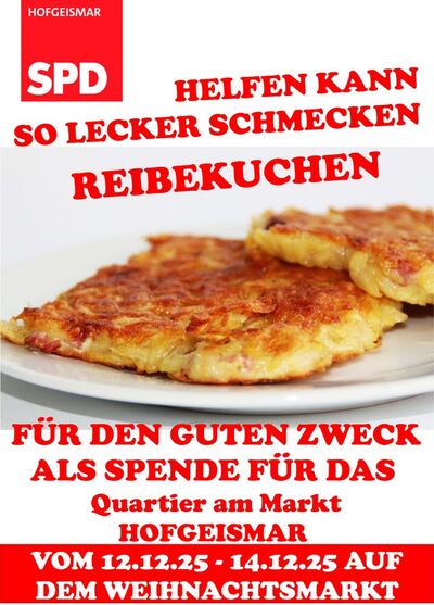 Mitglieder aus den SPD-Ortsvereinen werden am 3. Adventswochenende auf dem Hofgeismarer Weihnachtsmarkt ehrenamtlich Reibekuchen backen und diese gegen eine Spende zugunsten des Quartiers herausgeben, fasst Kolle die Aktion zusammen. Jeweils von 13-19 Uhr an gleicher Stelle wie in in den Vorjahren werden die leckeren Reibekuchen angeboten, den Teig dafür spendet die Bundestagsabgeordneten Esther Dilcher.